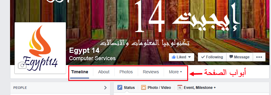 صفحة الفيسبوك بها أربعة علامات لأربعة أبواب يمكن للزائر التنقل بينهم والعلامة الخامسة لمزيد من الأبواب More ويمكن لمستخدم الفيسبوك تغير ترتيب هذه العلامات أو وضع علامات لأبواب جديدة بدلا من الأبواب الموجودة بالفعل