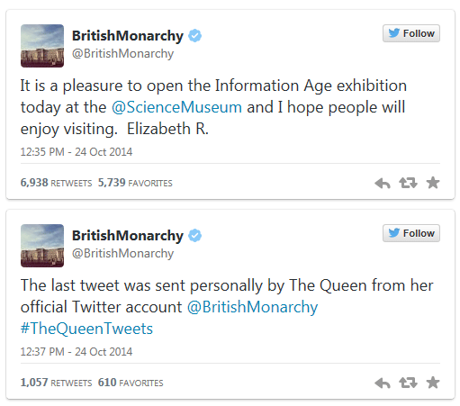 قامت الملكة إليزابيث بارسال التغريدة من حساب القصر الملكي البريطاني أمام 600 مدعو وقام المسئولون عن الحساب بتأكيد أن هذه أول تغريدة للملكة ومن المعروف أن معظم أعضاء العائلة المالكة البريطانية لا يقوم بارسال التغريدات بانفسهم