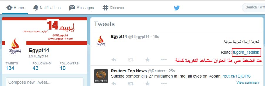 عندما تقوم باستخدام الموقع السابق في ارسال تغريدة طويلة لمن يتتبعك علي التويتر فإن الجزء الأول من التغريدة سوف يظهر لهم وبعد ذلك سوف يظهر عنوان URL لكي يتيح لمن يضغط عليه أن يقرأ التغريدة كاملة.