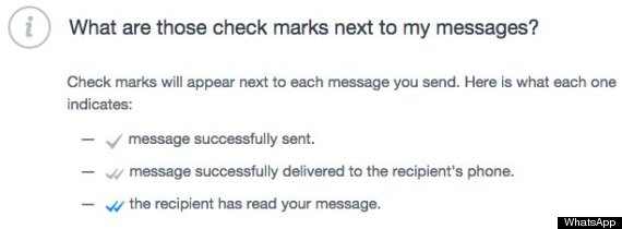 برنامج واتس آب يضع علامة صح “√” رمادية عندما يتم ارسال رسالتك ويضع علامتين “√√” عندما يتم استقبال الرسالة بنجاح علي التليفون الذي ترسل له الرسالة وهذا لا يعني أن متلقي الرسالة قد قام بقرائتها أم لا بل يعني فقط أن الرسالة قد تم استقبالها. الآن سوف تتحول العلامتين “√√” الي اللون الأزرق عندما تفتح الرسالة ويتم قرائتها. بدأ استخدام هذا التغير من أوائل سبتمبر الماضي.