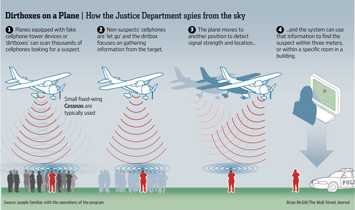 كشفت صحيفة وول ستريت جورنال أن أحد الهيئات التابعة لوزارة العدل الأمريكية تقوم بإطلاق طائرات تحتوي علي ما يشبه أبراج شبكات المحمول تقوم بإلتقاط المكالمات التليفونية من الهواتف المحمولة لآلاف الأشخاص منهم مجرمون والغالبية من المواطنيين الأمريكيين الأبرياء.