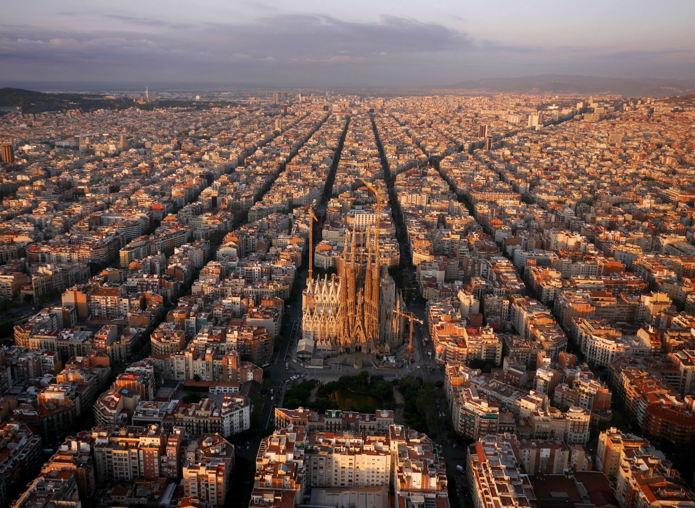 صورة لمدينة برشلونة ويظهر فيها التقسيم المعماري المنتظم لها وكنيسة أنتوني جوادي الأثرية كما تظهر من الجو