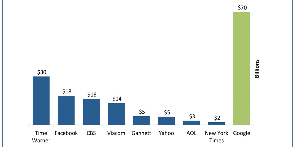 من المتوقع أن يبلغ دخل جوجل عام 2014 الي 70 مليار دولار وهو أكثر من ضعف دخل شركة تايم ورنر 30 مليار وأكثر من 14 ضعف شركة ياهو 5 مليار.