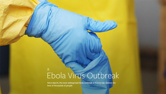 Ebola نشرت 29/12/2014 في 700 × 397 في عام 2014 علي الفيسبوك → السابق التالي ← منذ مارس 2014 حدث أكبر إنتشار لمرض الإيبولا في تاريخ البشرية وحصد الوباء آلاف الأرواح معظمهم من أفريقيا