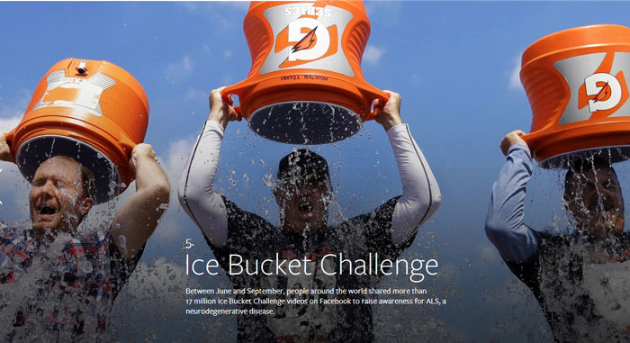 Ice-Bucket-Challenge- نشرت 29/12/2014 في 700 × 381 في عام 2014 علي الفيسبوك → السابق التالي ← ما بين شهري مارس الي سبتمبر شارك مستخدمي الفيسبوك فيلم حمام الثلج أكثر من 17 مليون مرة وهو فيلم يضم مشاهير العالم يفرغون ماء مثلج فوق رؤوسهم في حملة لمساندة مرضي التوحد