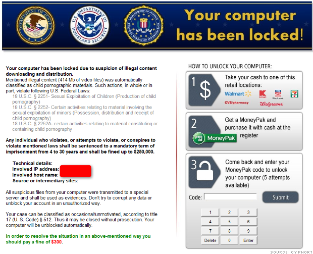الرسالة تقول أنك قمت بمشاهدة أحد الأفلام الإباحية ويجب أن تدفع غرامة قدرها 300 دولار لكي تستطيع التعامل مع الكمبيوتر مرة أخري.