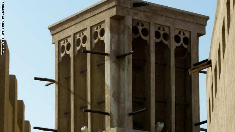 صورة 5/8 – لكن الإمارات العربية المتحدة تعمل على تجربة حلول تقليدية لتبريد الجو، مثل أبراج الرياح التي تعمل على رفع تيارات الهواء الصاعدة والسماح بدخولها للمنازل لتبريدها، وهنا يظهر في الصورة أحد الأمثلة على هذه الأبراج في منطقة البستكية التاريخية في دبي