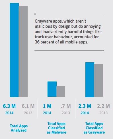 ووفقا للتقرير، الذي نشر موقع ياهو التقني أجزاء منه، فإن عدد هذا التطبيقات بلغ مليون تطبيق تقريبا، في زيادة واضحة عن عام 2013، الذي رصدت فيه الشركة نحو 700 ألف تطبيق خبيث ضمن تطبيقات أندرويد.