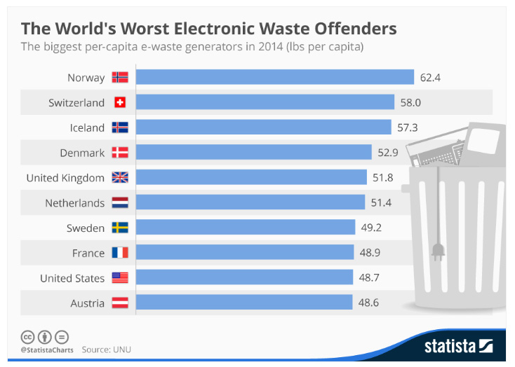 أكثر الدول إنتاجا للنفايات الإلكترونية لكل فرد من عدد السكان هي: