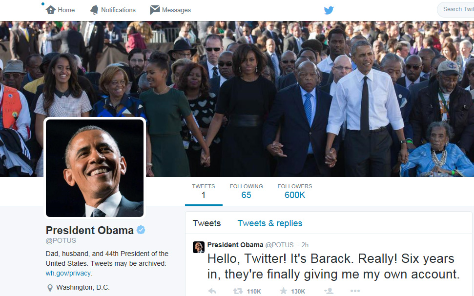 الحساب الشخصي لأوباما هو @POTUS ورغم أنه أطلق منذ ساعات قليلة ولم يتم بث أكثر من تغريده واحدة إلا أن عدد متابعة زاد علي 600 ألف شخص.