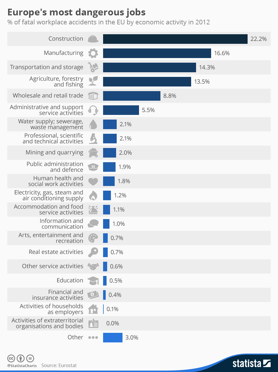 في دراسة نشرت أخير عن أخطر المهن في دول الأتحاد الأوربي وجد أن 3515 شخص توفي تحت ظروف أصابات العمل خلال عام 2012 وهي آخر سنة توفر فيها بيانات للقيام بالدراسة.