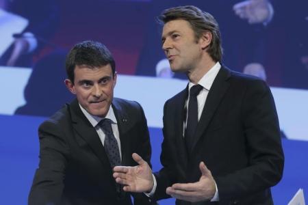 رئيس الوزراء الفرنسي مانويل فالس إلى اليسار وبجواره وزير المالية السابق فرانسوا بارو الذي عين رئيس لرابطة رؤساء البلديات الفرنسية يغادران اجتماعا للرابطة في باريس يوم 27 نوفمببر 2014