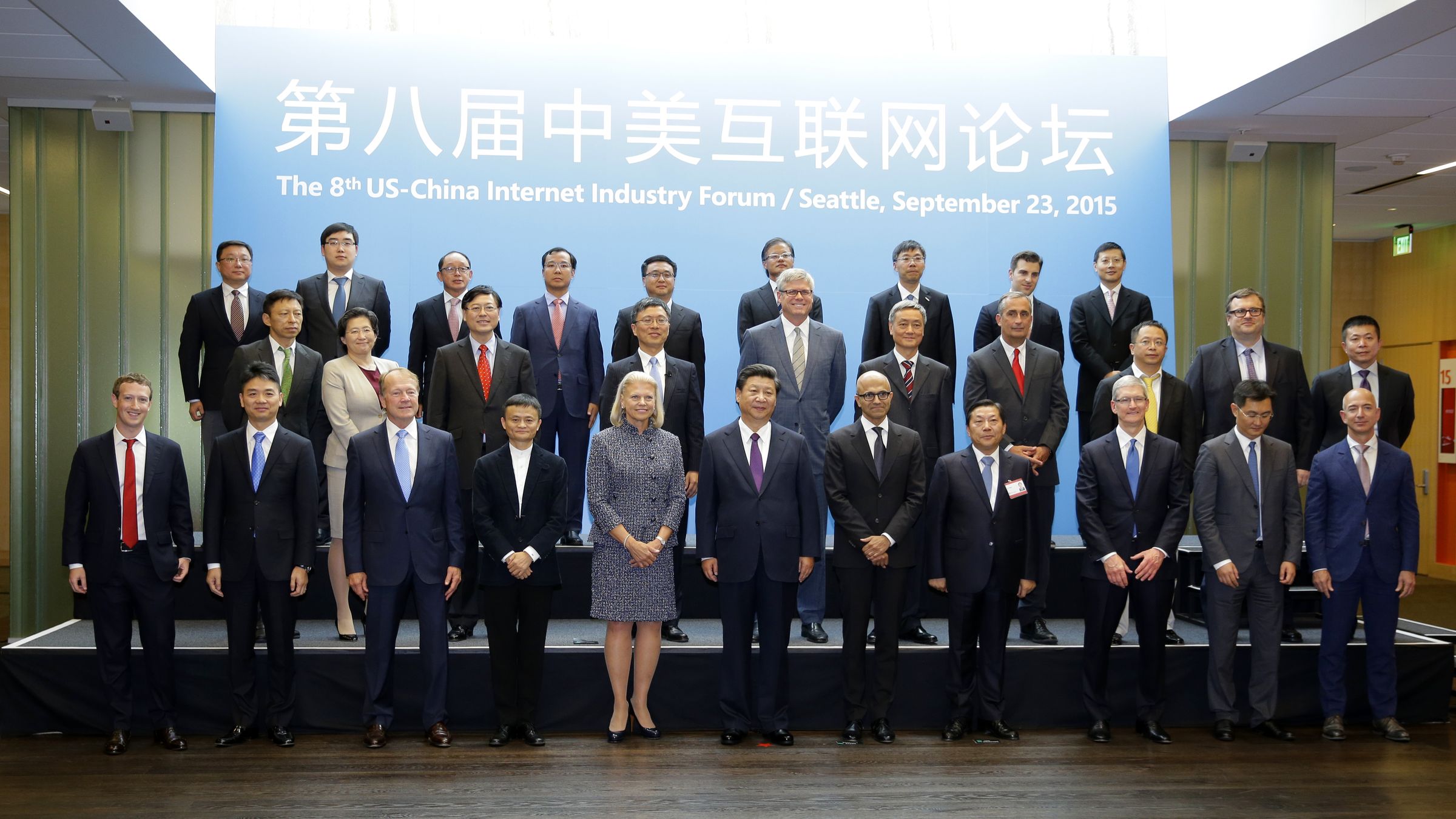 بجوار الرئيس الصيني يقف ساتيا ناديلا رئيس شركة مايكروسوفت التي تستضيف اللقاء، رجل الصين الأقوي في مجال الإنترنت czar Lu Wei يقف جوار ساتيا، ثم تري أثنين من أكثر رؤساء الشركات الأمريكية شعبية تيم كوك رئيس أبل و جيف بيزوز رئيس أمازون.
