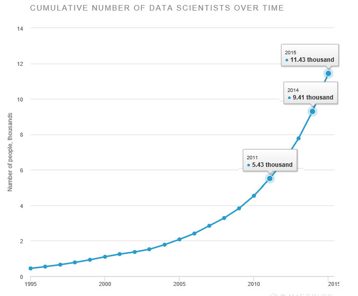 الرسم البياني يوضح أن عدد علماء البيانات قد قفز من 5430 عام 2011 الي 9410 عام 2014 ثم أرتفع الرقم الي 11430 عام 2015 في تطور ربما لم يحدث من قبل في أي فرع من فروع العلم الحديث.