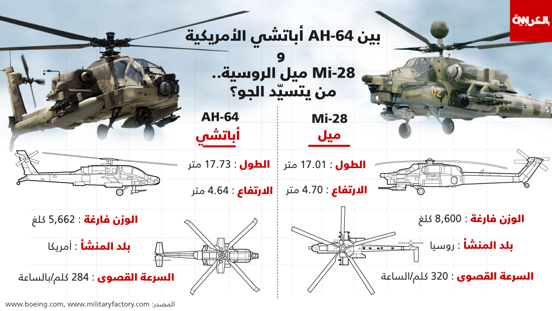 أما طائرة الأباتشي الأمريكية، فقد شكلت لنفسها سمعة عسكرية ممتازة في الحروب التي خاضتها القوات الأمريكية خلال السنوات الماضية، وتمتلك المروحية مقدمة مزودة بأجهزة حساسة لرصد الأهداف، إلى جانب نظام للرؤية الليلية، كما أنها تحمل رشاشا من عيار 30 ملم.