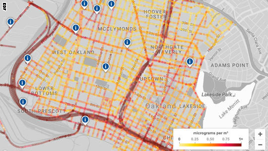 إذ أظهر تقرير جديد صادر عن “صندوق الدفاع عن البيئة” بيانات تظهر جودة الهواء في حي سكني واحد بمدينة “أوكلاند” الواقعة في ولاية كاليفورنيا، البيانات فصّلت تغير جودة الهواء بالتفصيل من شارع لآخر.