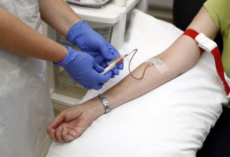 متطوعة تتبرع بالدم في مركز في اكسفورد بجنوب انجلترا