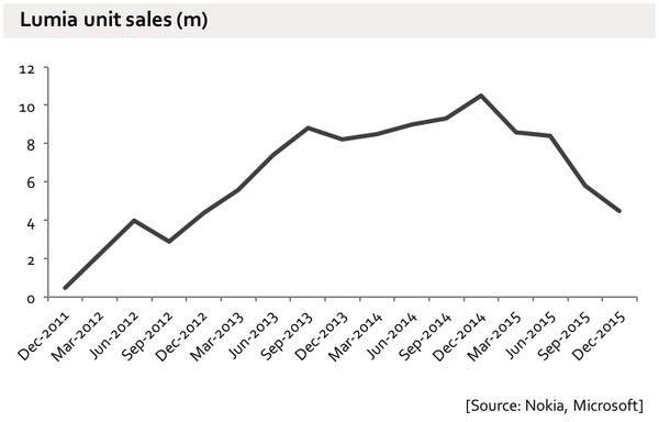 خلال الفترة من بداية 2011 حتي نهاية 2015 باعت مايكروسوفت 110 مليون جهاز ويندوز فون بينما في نفس الفترة باعت أندرويد وiOS حوالي 4.5 مليار جهاز