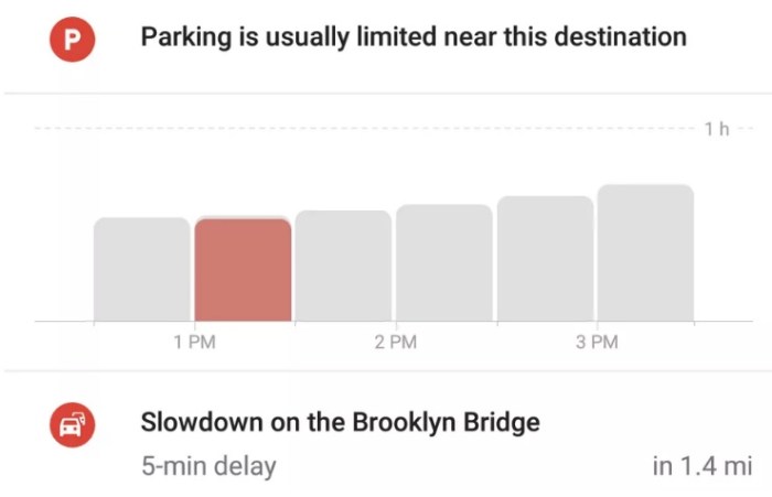 وإلى جانب عرض الوقت المقدر والمسافة، يظهر شريط بياني جديد يعرض الوقت النسبي الذي سوف تستغرقه الرحلة موضحًا باللون الأخضر أو الأصفر أو الأحمر للإشارة إلى حالة الحركة المرورية الحالية، بالإضافة إلى الوقت المقدر للوصول في حال خرج المستخدم تمامًا قبل الوقت المقدر للوصول أو بعد عدة ساعات.