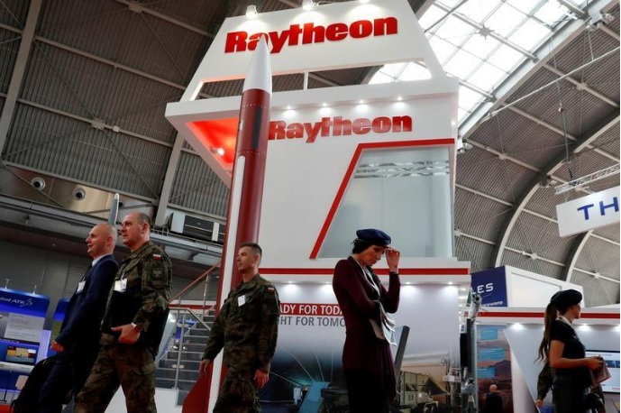 أشخاص يمرون بمنصة تابعة لشركة رايثيون الأمريكية المصنعة للصواريخ في معرض عسكري دولي في بولندا