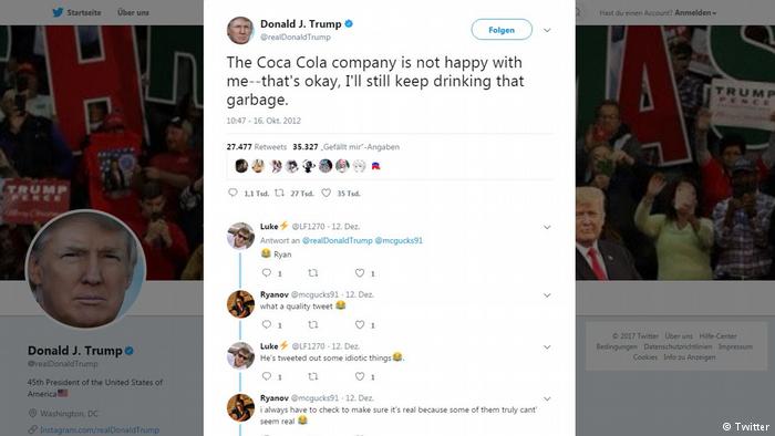 تغريدة ترامب التي يقول فيها أن شركة كوكاكولا ليست سعيدة به ورغم ذلك هو مستمر في شرب منتجاتها (الزبالة)