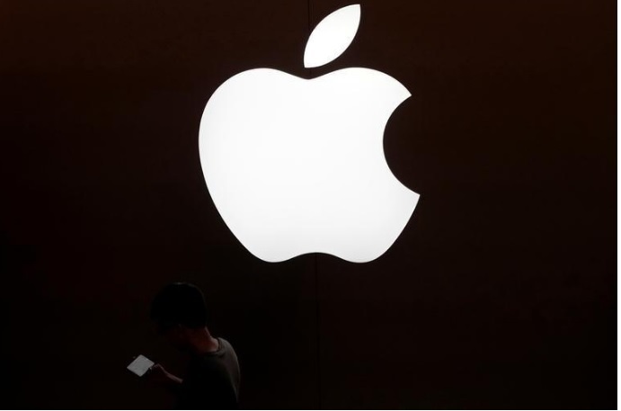 رجل ينظر لشاشة هاتف ذكي أمام شعار شركة أبل في شنغهاي في صورة التقطت يوم 30 يوليو