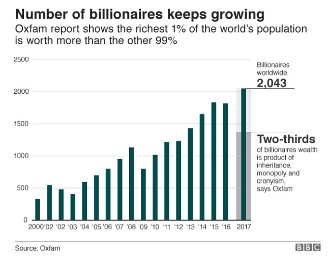 أما هذا العام، فأكدت المنظمة أن ثروة 42 من أغنى أغنياء العالم تعادل ثروة نصف الفقراء في العالم، ثم أعادت المراجعة لتصبح ثروة 61% من ثروة أغنى أغنياء العالم.