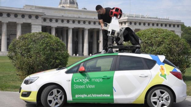 سيارة جوجل بها سارية مركب عليها كاميرات تصور الشوارع من جميع الاتجاهات خلال سير السيارة