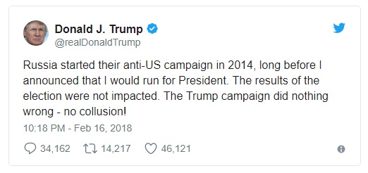 جاء ذلك في تغريدة على تويتر نشرها ترامب بعد أن وجه المحقق الخاص الأمريكي روبرت مولر اتهامات إلى 13 روسيا وثلاثة كيانات روسية بالتدخل في الانتخابات.