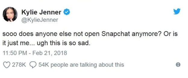 تسببت نجمة تليفزيون الواقع الأمريكية كايلي جينر في خسارة كبيرة لشركة سناب، التي تملك تطبيق التواصل الاجتماعي سناب شات.