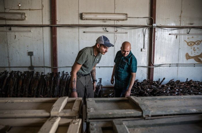 في المقر الرئيسي للاستخبارات العراقية في بغداد يقف مفتش الأسلحة دامين سبليتيرز وبجانبه زميله حيدر الحكيم يفحصون صناديق ذخيرة لتنظيم داعش