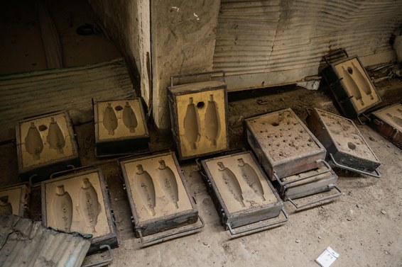 وجد فريق “سبليترز” صناديق لقذائف الهاون 119.5 ملم في بازار مهجور في تلعفر، حيث ساعدت المحلات التجارية المحكمة الغلق والتي لديها سقوف معدنية على إبقاء مصانع أسلحة داعش مخبأة