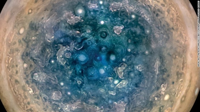 صورة للقطب الجنوبي لكوكب المشتري ألتقطتها المركبة الفضائية جونو من علي أرتفاع 52 ألف كيلومتر وهي توضح عواصف عاتية بشكل بيضاوي يبلغ قطرها حوالي 1000 كم