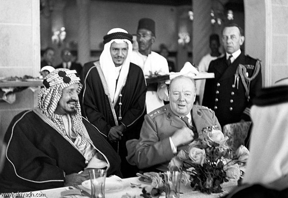 مؤسس المملكة العربية السعودية الملك عبد العزيز آل سعود، مع رئيس الوزراء البريطاني ونستون تشرشل