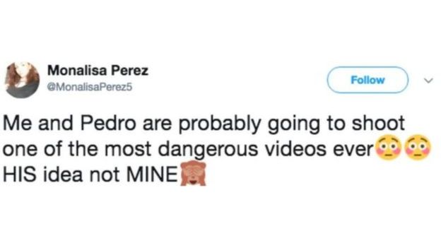 وكتبت موناليزا تغريدة على موقع تويتر قبل تصوير مقطع الفيديو قالت فيها :”من المحتمل أن نصور أنا وبيدرو أحد أكثر مقاطع الفيديو خطورة، إنها فكرته هو وليست فكرتي”.