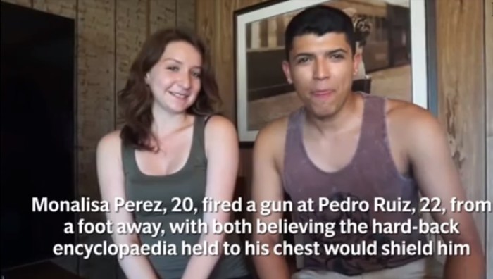 وأقنع بيدرو رويز، 22 عاما، صديقته موناليزا بيريز، 20 عاما وأم لطفلين، بأن تطلق النار عليه من مسدس من مسافة قريبة معتقدا أن الرصاص لن يخترق كتابا سميكا سيضعه أمام صدره، على أمل أن يحقق الفيديو انتشارا على الإنترنت.