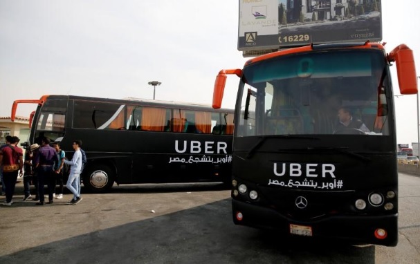حافلتان تابعتان لأوبر لنقل مشجعين إلى استاد في الإسكندرية قبل مباراة للمنتخب المصري أمام نظيره الغاني في التصفيات المؤهلة لكأس العالم لكرة القدم روسيا 2018