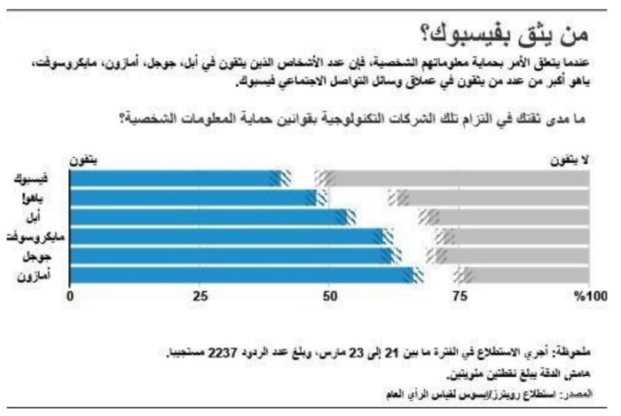 ويظهر الاستطلاع الذي أجري من يوم الأربعاء 21 مارس حتى يوم الجمعة 23 مارس أن عدد الأمريكيين الذين يثقون في فيسبوك أقل ممن يثقون في شركات التكنولوجيا الأخرى التي تجمع بيانات المستخدمين مثل جوجل وأمازون دوت كوم ومايكروسوفت وياهو.