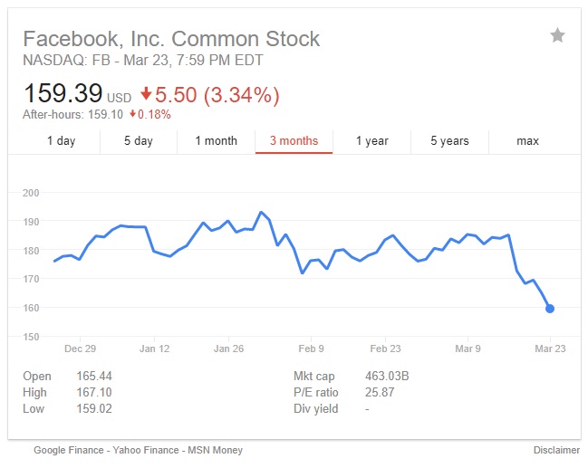 هبطت أسعار أسهم شركة فيسبوك بصورة هائلة لتتراجع من 93 دولارا، بداية فبراير 2018، إلى 159.39 دولارا يوم 25 مارس