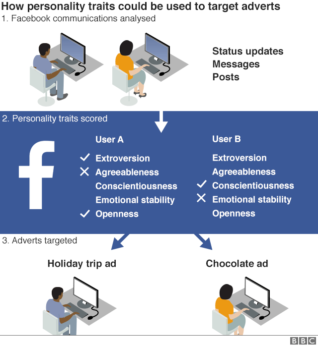 طريقة استخدام تحليل السمات النفسية لمستخدمي الفيسبوك بحيث يتم عرض إعلانات عن قضاء الأجازات السياحية للأول بينما تعرض إعلانات عن الشيكولاته للثاني