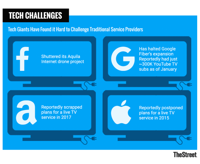 فشل عمالقة تكنولوجيا المعلومات مثل جوجل وفيسبوك وأبل وأمازون في منافسة شركات الأتصالات في بناء بنية تحتية جديدة سواء لشبكة الإنترنت أو للأعلام المرئي