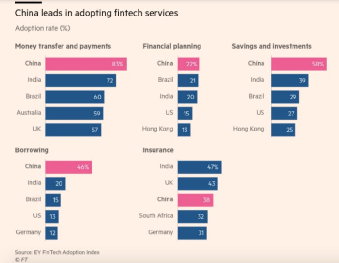 تحتل الصين المركز الأول لاستخدام الموبايل في: تحويل الأموال والدفع بنسبة 83% و التخطيط المالي 22% والأستثمار والتوفير بنسبة 58% والأقتراض بنسبة 46% والمركز الثالث في التأمين 38%