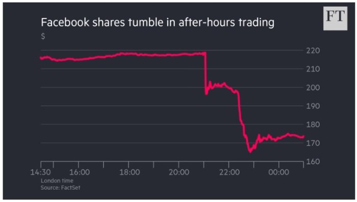 وانخفضت أسهم فيسبوك في البداية بنسبة 12% تقريبًا في تعاملات ما بعد الإقفال في نيويورك، لكن الخسائر تسارعت مع إعلان الشركة عن خطط الإنفاق الخاصة بها.