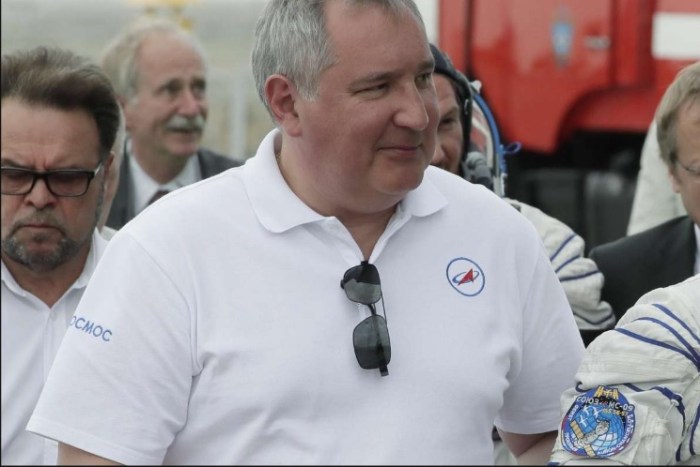 رئيس شركة الفضاء الروسية روسكوزموس – ديمتري روجوزين ، يرافق طاقم طاقم محطة الفضاء الدولية الجديد ، إلى الصاروخ قبل إطلاقه في بايكونور كوسمودروم الروسي المستأجر ، في كازاخستان