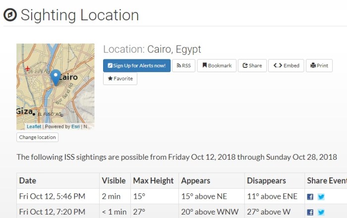 قامت ناسا بإنشاء موقع علي الإنترنت للمساعدة في تحديد المكان والوقت الذي يمكنك أن تشاهد فيهما المحطة الفضائية الدولية في السماء وذلك بعد أن تحدد اسم الدولة والمدينة التي توجد بها.