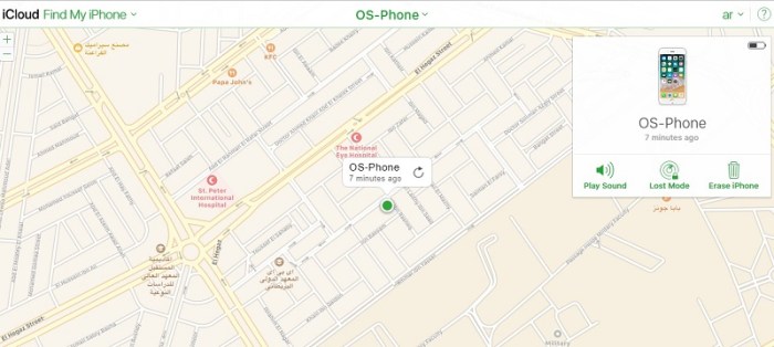 بعد تسجيل الدخول باسم المستخدم وكلمة المرور، يظهر مجموعة من الأختيارات ومنها في الأسفل زر العثور على الأيفون Find My iPhone، وعند الضغط عليه يبحث الموقع عن الموبايل ويحدد موقعه على الخريطة على شكل نقطة خضراء.