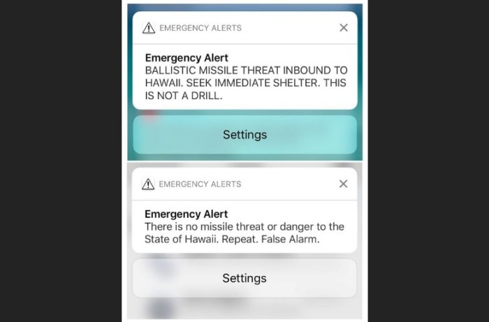 صورة للإنذار الذي أرسل إلى أجهزة موبايل أمريكيين للتحذير من هجوم صاروخي وتكذيبه في رسالة لاحقة