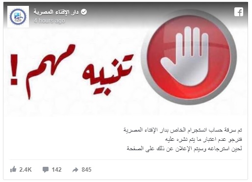 أعلنت دار الإفتاء المصرية، عبر صفحتها الرسمية على “فيسبوك”، سرقة حساب الدار في موقع “إنستجرام”.