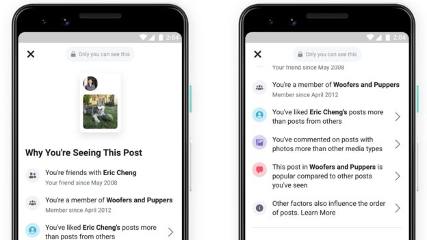 وستضيف الشركة زرا خاصا في صورة سؤال “لماذا أرى هذا المنشور (البوست)؟“، والذي يسرد أسباب عرض المنشورات على صفحة المستخدم، ويوضح أنشطة المستخدمين التي تدفع خوارزميات موقع فيسبوك لتحديد أولويات ما يعرض على صفحاتهم.