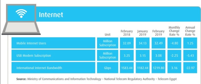 كما أظهر التقرير أن سعة خطوط الإنترنت الدولية التي تخدم مصر قد إنخفضت من 1583 جيجا/بت ثانية في شهر فبراير 2018 الي 1219 جيجا/بت ثانية في فبراير 2019 بإنخفاض قدره حوالي 23% خلال عام.